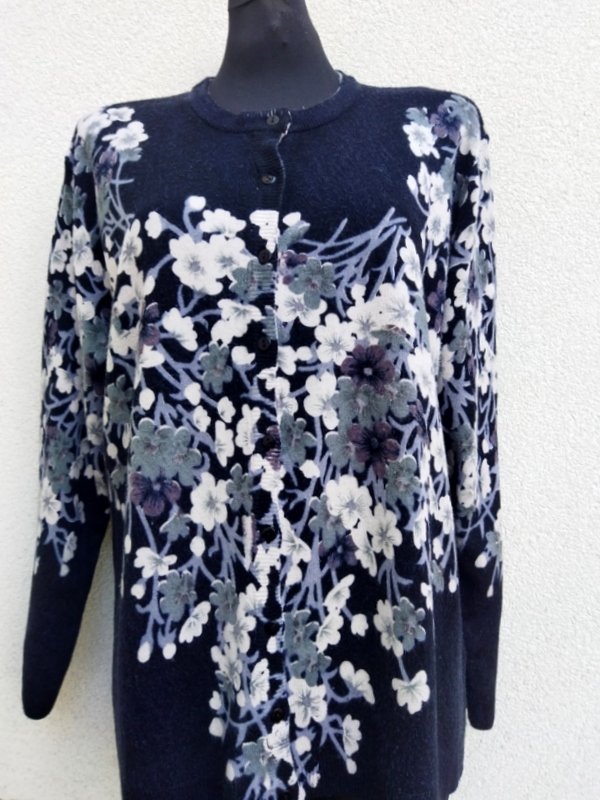 Akrylowo-wełniany sweter typu kardigan z kwiatowym wzorem w kolorach złamanej bieli, rozwodnionej zieleni, gołębiej szarości i cappuccino na czarnym tle. Zapinany na całej długości na małe guziczki. Wykończony ściągaczami