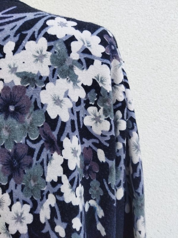 Akrylowo-wełniany sweter typu kardigan z kwiatowym wzorem w kolorach złamanej bieli, rozwodnionej zieleni, gołębiej szarości i cappuccino na czarnym tle. Zapinany na całej długości na małe guziczki. Wykończony ściągaczami