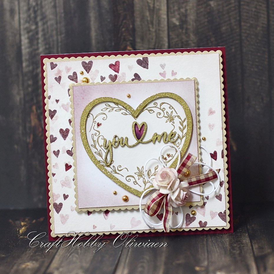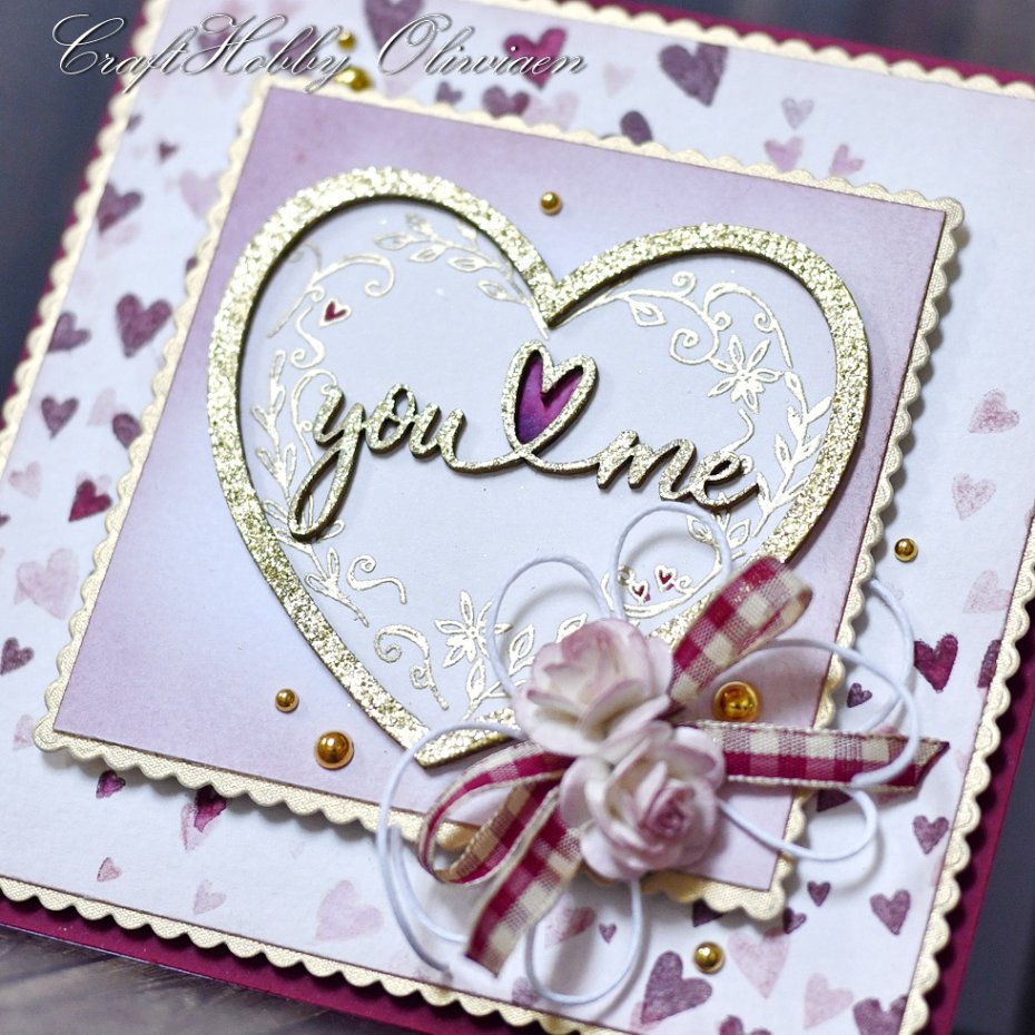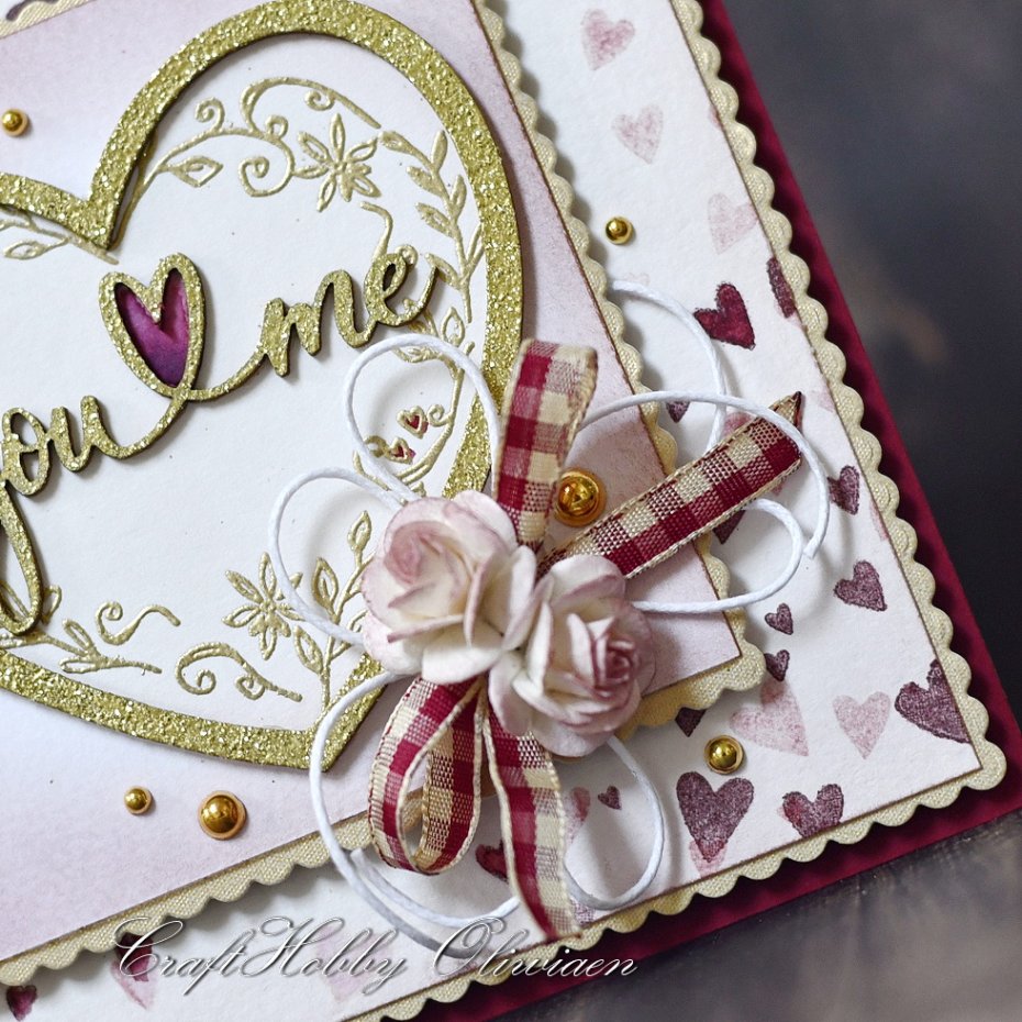 Kartka wykonana na bazie papieru akwarelowego i papierów do scrapbookingu, ozdobiona stemplowanymi serduszkami w tle, motywem serca i napisu z embossowanej tekturki, stemplowanego i embossowanego motywu serca z listków i kwiatów, różyczkami mulberry, wstążką w kratkę, sznureczkiem i złotymi perełkami.