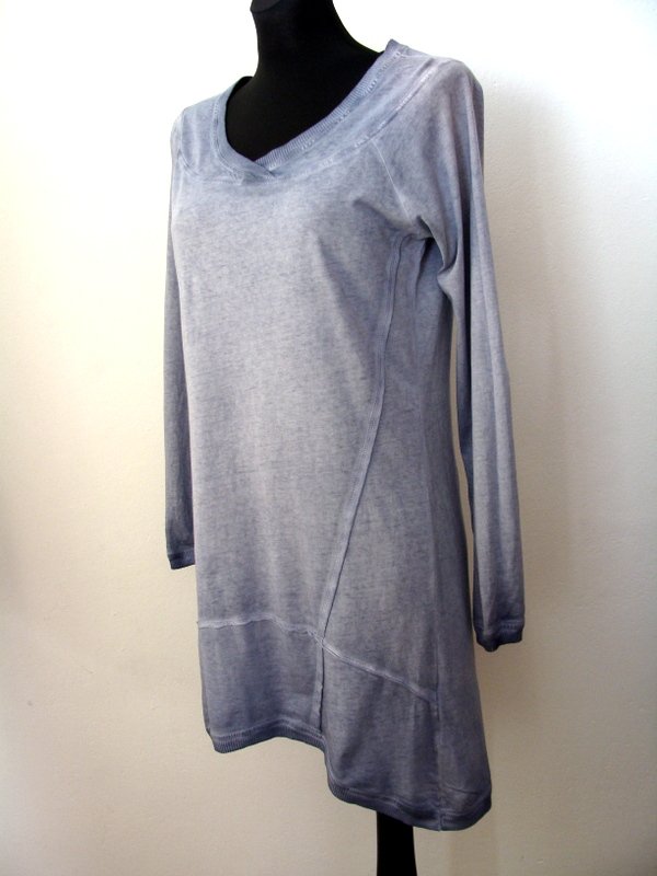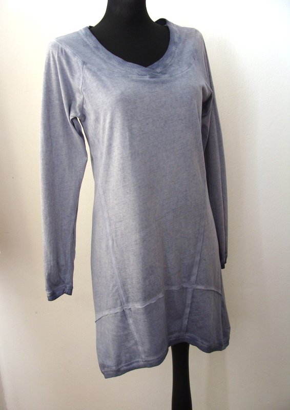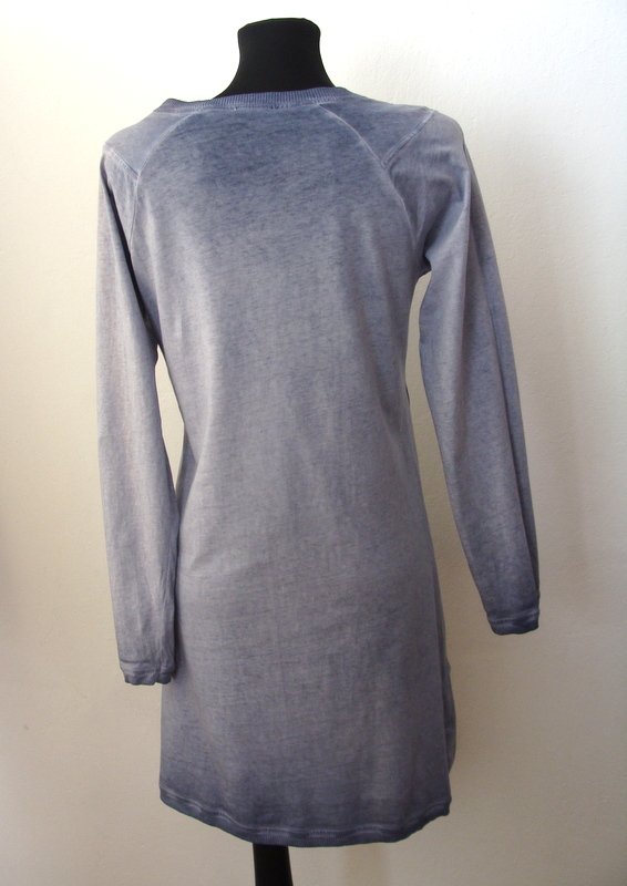 Fajna sukienka z cienkiej dekatyzowanej bawełnianej tkaniny dzianinowej w cieniowanym szarym kolorze, z raglanowymi rękawami. Asymetryczna - podkrojony przód krótszy od tyłu.