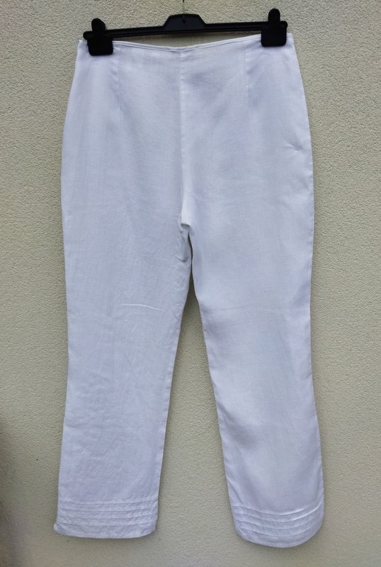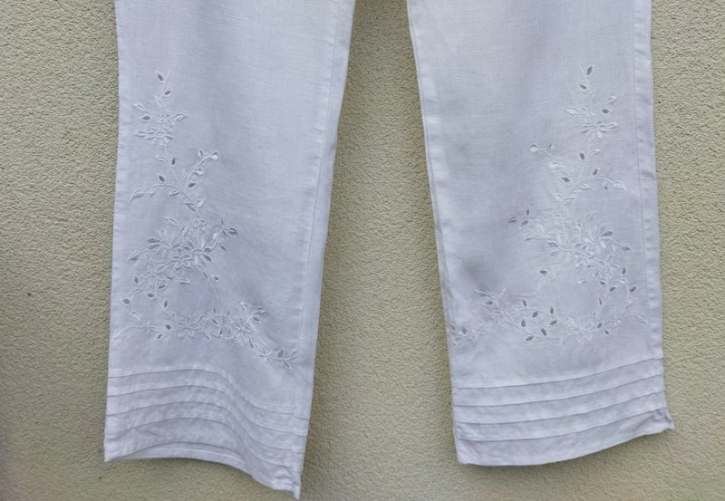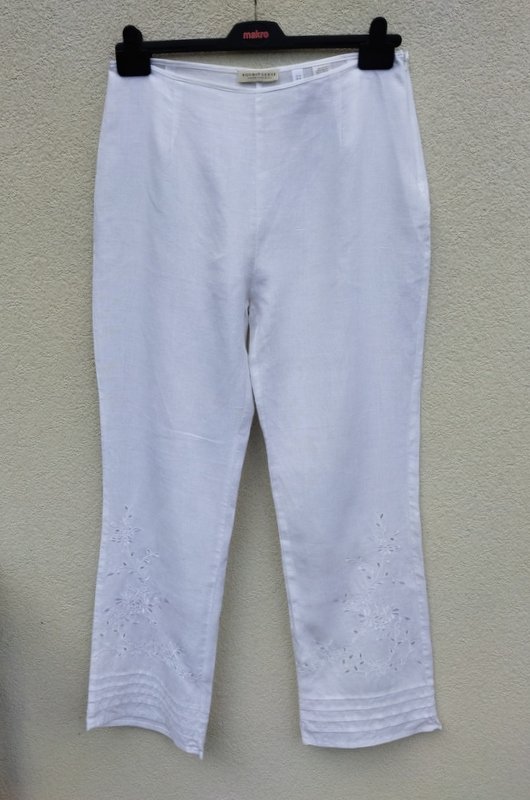 Spodnie z lnianej tkaniny w białym kolorze o klasycznym kroku z prostymi nogawkami , zdobione u dołu szczypankami i haftem z przodu nogawek. zapinana z boku na zamek.