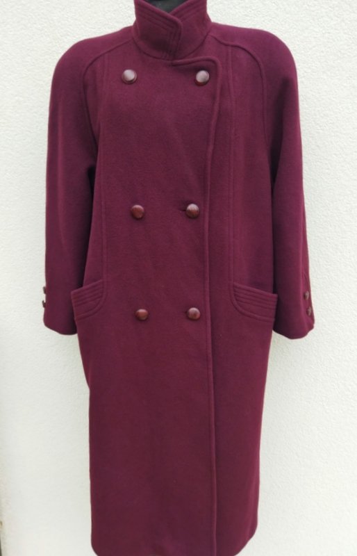 Świetnej jakości płaszcz z wełnianej tkaniny flauszowej z nylonem w burgundowo-śliwkowym kolorze. Starannie uszyty i wykończony. Z dwiema wpuszczanymi kieszeniami , z raglanowymi rękawami, z tyłu ozdobna plisa- zakładka . Dwurzędowy - zapinany na guziki, można go zapiąć c wysoko pod szyja lub z nosić z rozchylonymi rewersami. Całość na eleganckiej wiskozowej podszewce w kolorze.