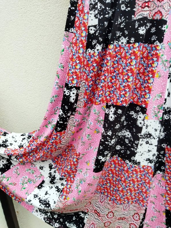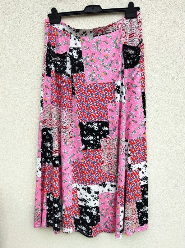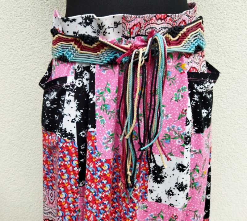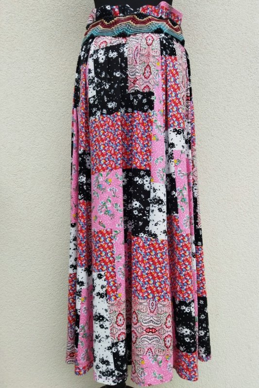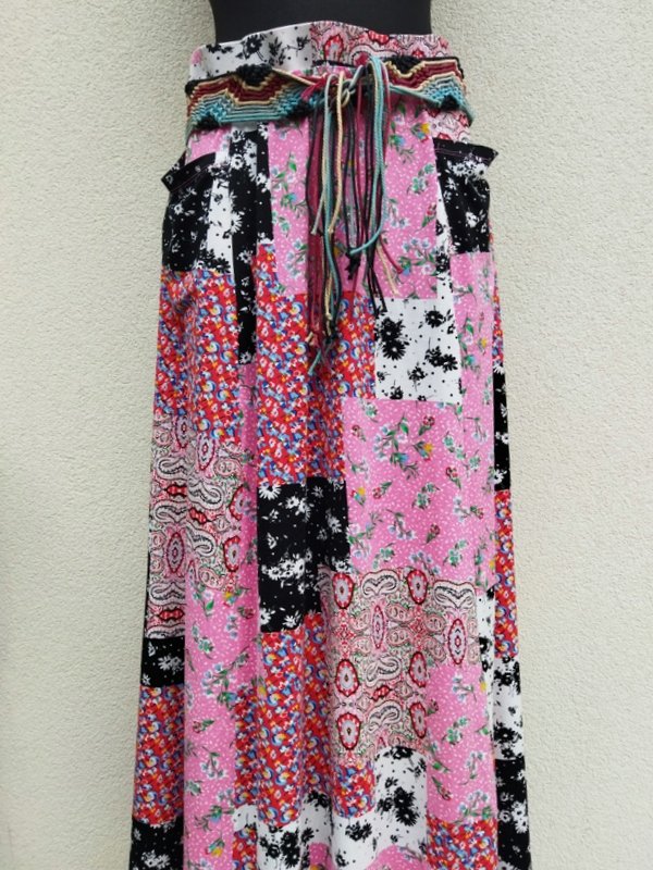 Trapezowa spódnica maxi szyta z klinów z wiskozowej tkaniny dzianinowej w patchworkowe kwiatowe wzory w kolorystyce bieli czerwieni, czerni , różu, błękitu, żółci i zieleni . Na wszytej gumie w pasie. , bez podszewki. Miła, podatna i rozciągliwa. Sprzedawana bez paska na zdjęciu