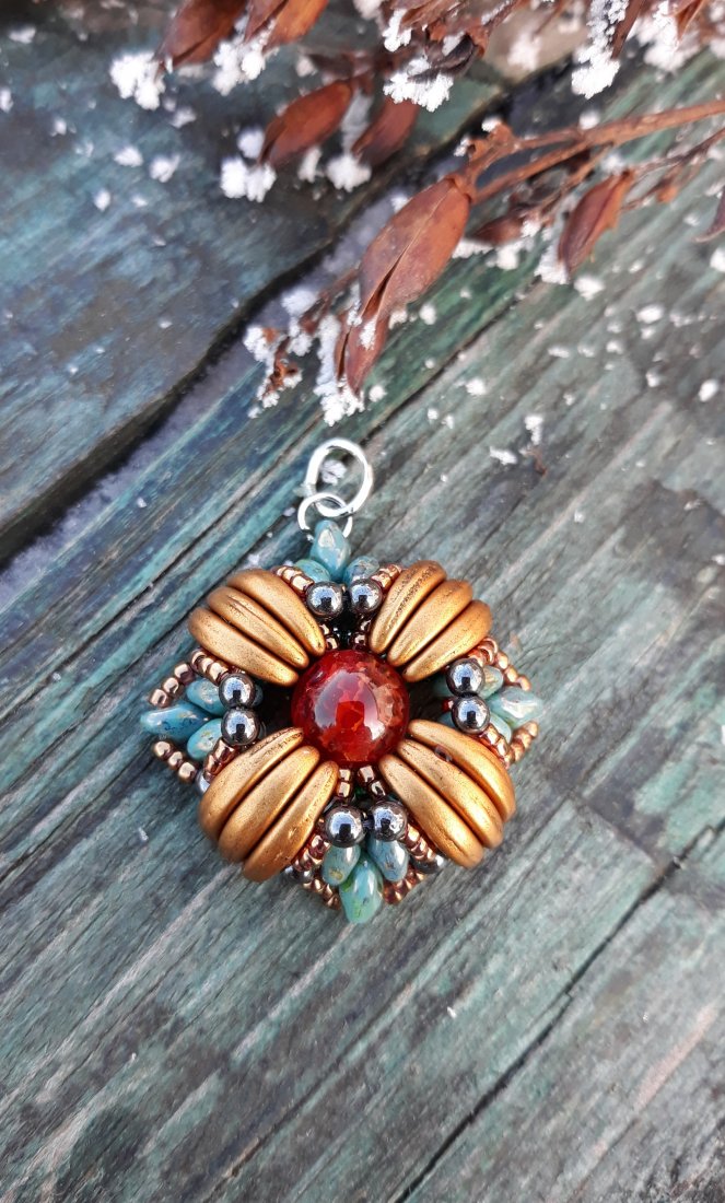 ,,z agatem,, to mały wisior wykonany z ognistego agatu oplecionego szklanymi koralikami i kryształkami w różnych odcieniach złota i turkusowej zieleni, z dodatkiem czarnego hematytu. Elementy metalowe użyte to stal szlachetna.