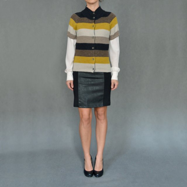 Piękny jesienny sweterek z krótkim rękawem. Z wełną i alpaką (troszkę gryzie). Zapinany na guziczki. Świetny na koszulę lub bluzkę. W kolorach brązu, beżu, cappuccino i musztardy.