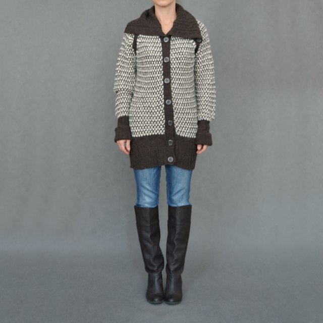 Ciepły sweter z alpaką. Można postawić wysoki golf. Zapinany na guziki. Trochę gryzie - jak to wełna.
