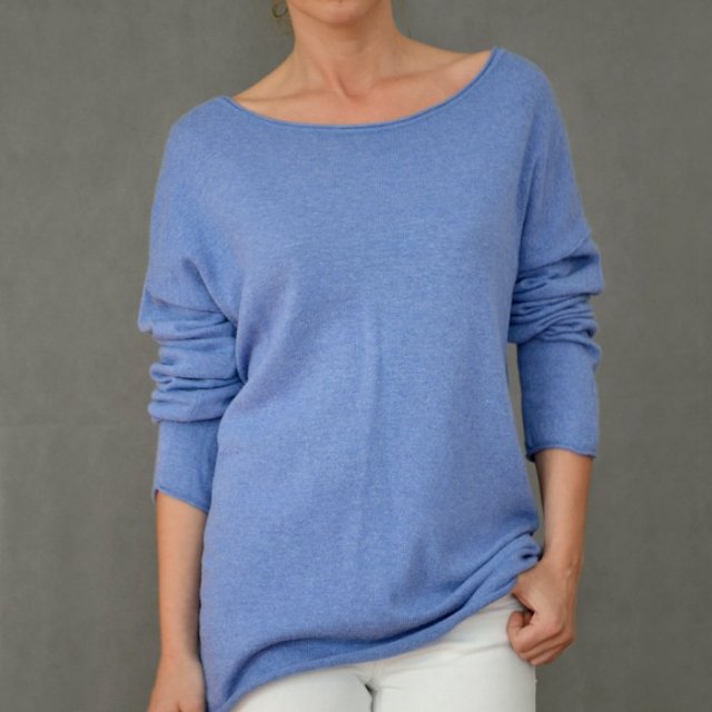 Miękki sweterek z dodatkiem angory. Luźny i z większym dekoltem. W kolorze zgaszonego niebieskiego - kolor może się troszkę różnić od zdjęć. Jest bardziej zgaszony.