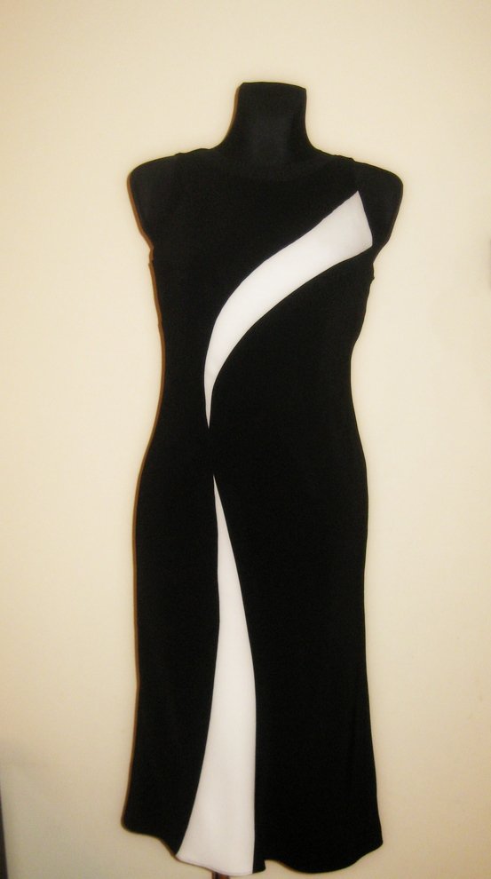 bardzo delikatnie taliowana czarna sukienka z wszytą białą wstawką, marki Principles. cięta ze skosu, podszewka tylko do wysokości biustu, wkładana bez zamka. Materiał 40% wiskoza 60% acetat (włókno celulozy). Stan bardzo dobry. Rozmiar z metki 12, ale ze względu na krój polecałabym na 36 małe 38. Podaję wymiary mierzone na płasko;