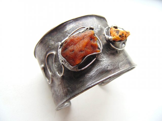 Bransoleta wykonana z miedzi, cyny i surowych bursztynów. Szerokość ok. 4 cm. Obwód regulowany.