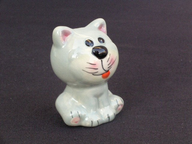 Porcelanowa kocia figurka - osobowość niebanalna, ręcznie malowana, na błyszcząco szklwiona. Pusta w środku. W przyjemnej pastelującej szarości. 4,5 x 4 x 6,5 cm. Stan zachowania bardzo dobry.