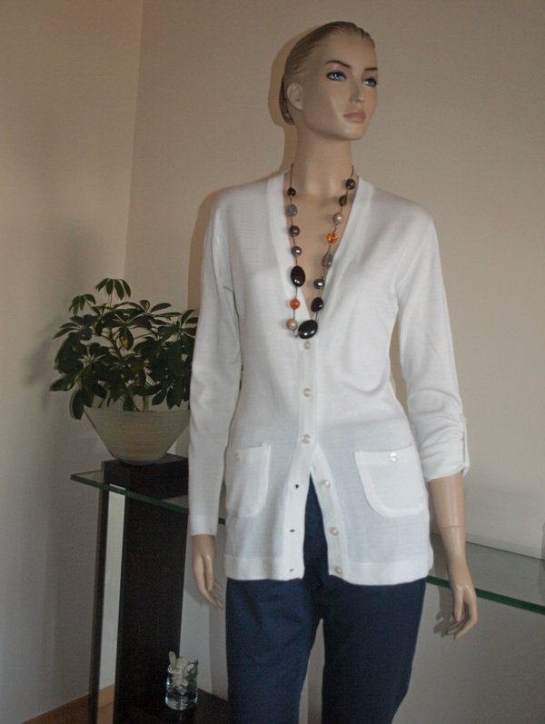 Biały, kardigan marki Blinc. Stan bardzo dobry, jak nieużywany. Materiał 50% cieniutka wełna, 50% akryl. Opcja podpięcia rękawów. Brak metki z rozmiarem, ale myślę, że to 36. Podaję wymiary mierzone na płasko;