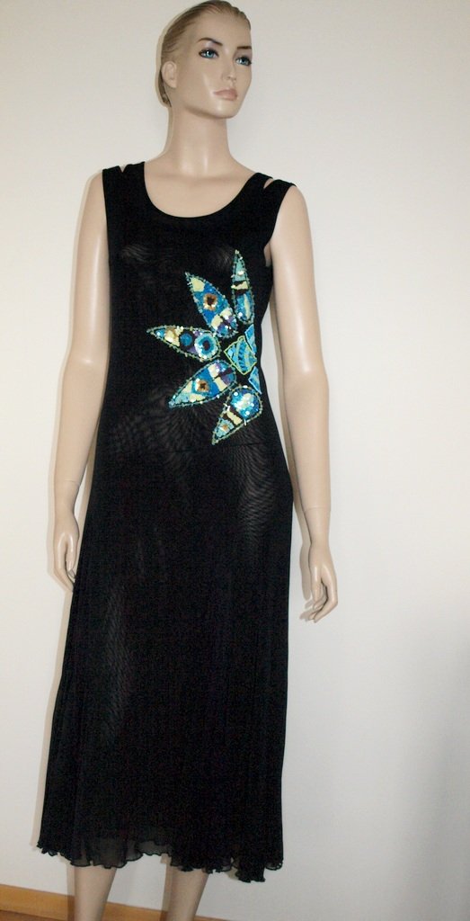 bardzo kobieca czarna, prosta dwuwarstwowa sukienka Materiał 100% nylonowa, rozciągliwa siateczka. ozdoba jest piękna aplikacja z cekinów i kamyków, oraz dół z wstawianymi godetami. Stan bardzo dobry. Rozmiar prawdopodobnie 38,na manekinie o rozmiarze 38. Podaję wymiary mierzone na płasko;