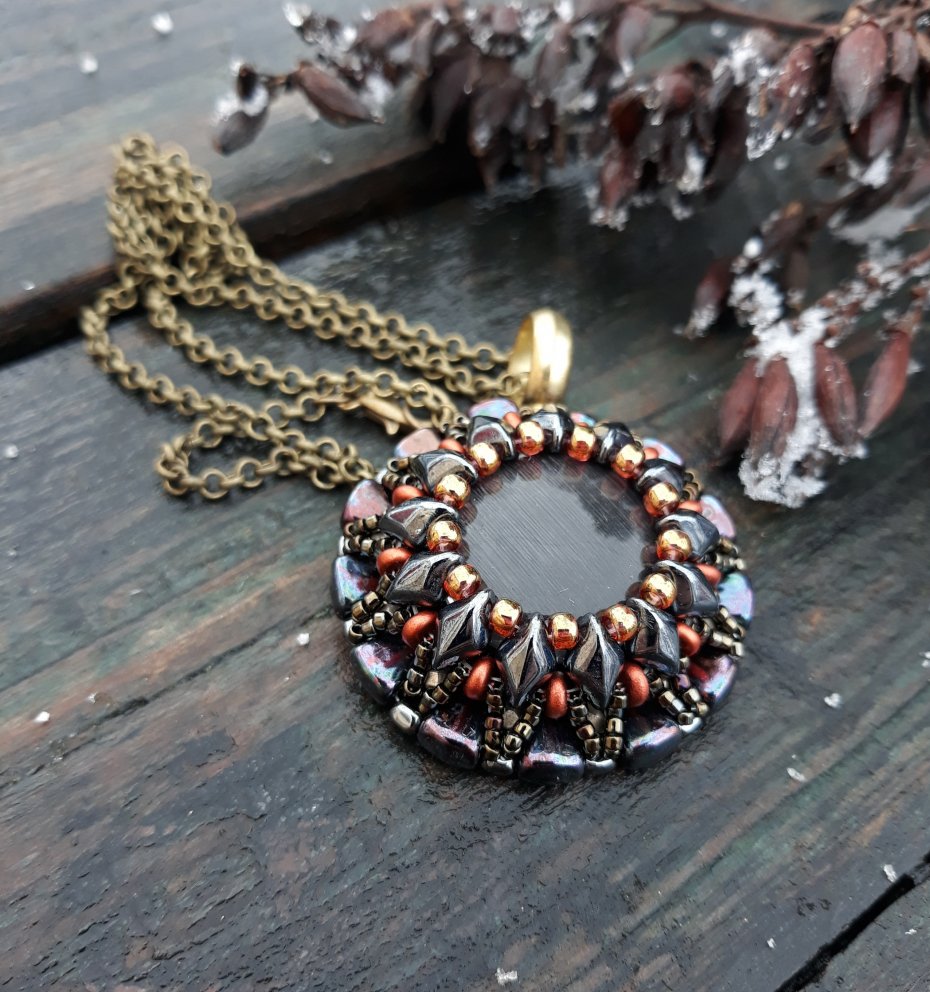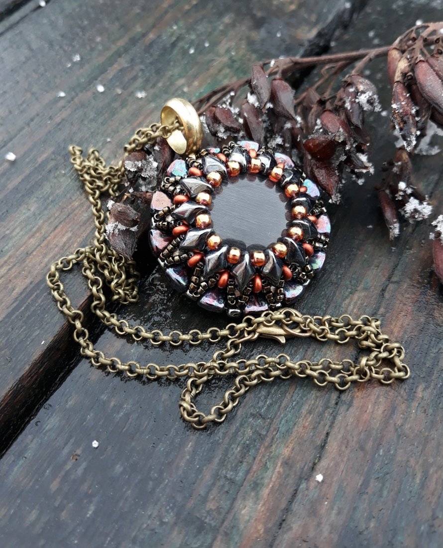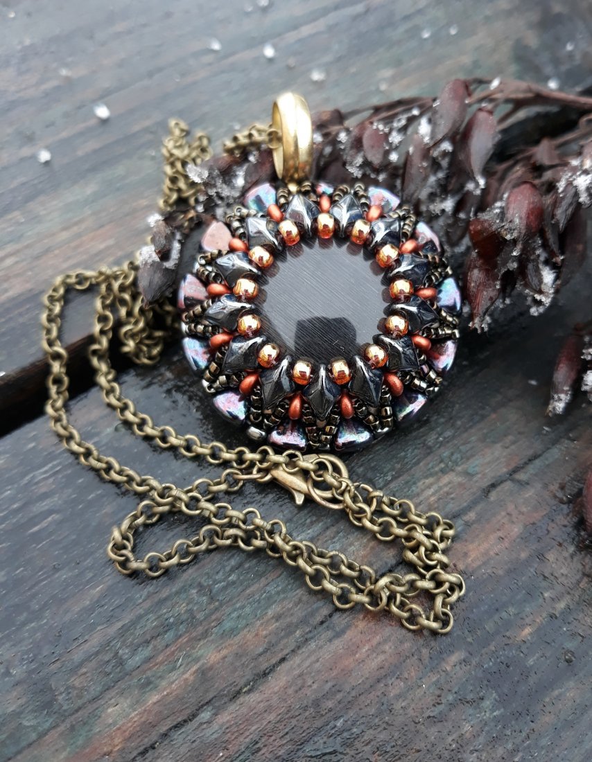 ,,z czarnym oczkiem,, to wisior wykonany z czarnego kociego oka oprawionego w szklane koraliki i kryształki w odcieniach czerni, złota i czerwieni. Wisior zawieszony jest na ozdobnym łańcuszku w kolorze mosiądzu.