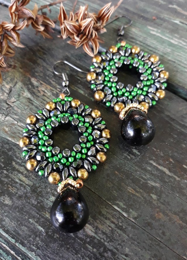 Kolczyki w kształcie rozetek wykonane ze szklanych koralików i kryształków w odcieniach zieleni, zlota i czerni, z dodatkiem kropli czarnego onyksa. Kolczyki zawieszone są na klasycznych oksydowanych biglach.