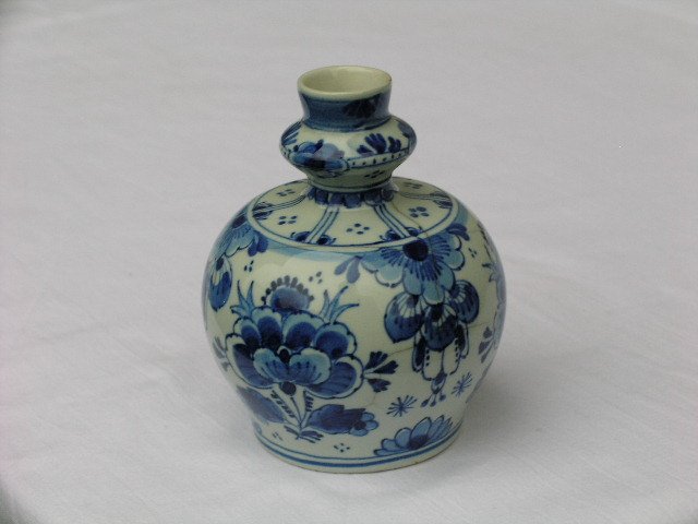 Oryginalny, ręcznie malowany holenderski wazonik, pięknie sygnowany, z kultowej manufaktury w Delft. Dawnej daty, z pęknięciem od zewnątrz, ale nie przeciekający. Tak urzekający swą niebieskością i radością ludowawego wzoru, że wart ocalenia, ukochania, kolejnego życia... Ciekawy kształt; w całości ręcznie wykonany. Podszkliwnie malowany, na błyszcząco wykończony. Pękatość 7; wysokość 9,5 cm. Stan zachowania - pęknięty, ale wciąż użytkowy :) Pęknięcia nie widać,wazonik nie przecieka...jeno wyczuwalna opuszkiem pakca ryska wskazuje na ten przykry fakt.Poza tym pięknie zachowana malatura i wielki urok niewielkiej formy :)