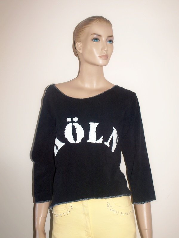 Czarna bluza z dłuższym tyłem marki Crazy world. Materiał 80% bawełna, 20% poliester, przypomina drobną frotte. Wykończony białą tasiemką, z przodu napis malowany białą farbą. Rękaw 7/8. Rozmiar z metki 42/44, ale polecałabym na 38. Podaję wymiary mierzone na płasko;