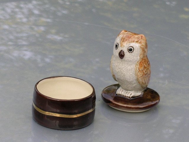 Zabawne puzderko z sowią figurką, szlachetnie ceramiczne, lekkie, na błyszcząco szkliwione, ręcznie wykonane i malowane, z charakterystycznym szkliwieniem. Made in Japan. Przyjazna dekoracja z uśmiechem :) Dół 5,5; wysokość 9,5 cm. Stan zachowania bardzo dobry.