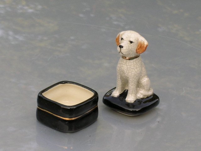 Zabawne puzderko z psią figurką, szlachetnie ceramiczne, lekkie, na błyszcząco szkliwione, ręcznie wykonane i malowane, z charakterystycznym szkliwieniem. Made in Japan. Przyjazna dekoracja z uśmiechem :) Dół 5 x 6; wysokość 10,5 cm. Stan zachowania bardzo dobry.