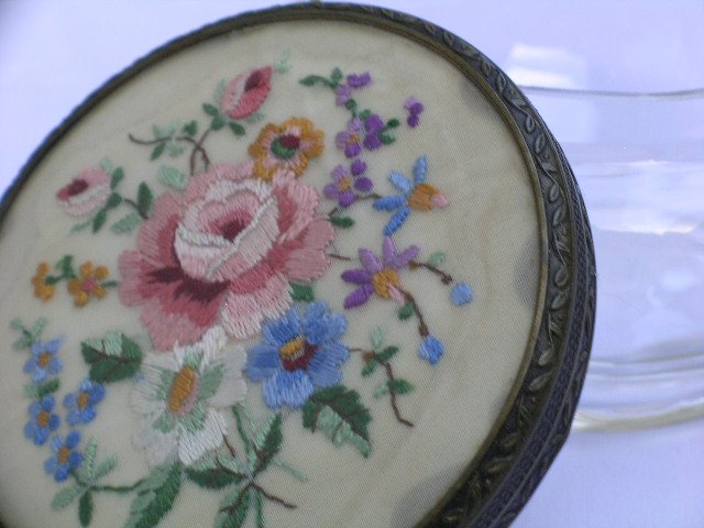 Romantycznym bukietem zdobne cienko-szklane naczynie toaletowo-łazienkowe, bardzo przyjemne w obcowaniu, z ręcznie haftowanym medalionem-przykrywką wyjątkowej urody. Szlachetne, nie sygnowane. Dół 8; pękatość 11; wys. 6,5 cm. Stan zachowania bardzo dobry minus.