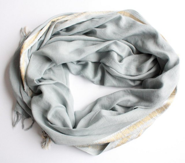 Duży, miękki szal w stonowanym odcieniu szarości z kroplą błękitu, ozdobiony na brzegach subtelnymi zlotymi i srebrnymi ornamentami. Nie jest to w żadnym wypadku jarmarczna ozdoba, odcienie są delikatne i eleganckie, bez brokatowego błysku.