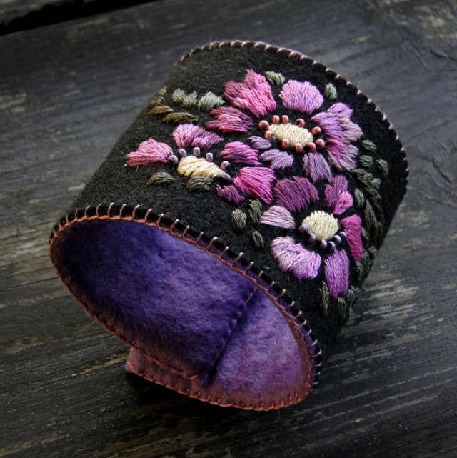 Przepiękna ( ładniejsza niż na zdjęciu) bransoleta, szeroka, ozdobna, a lekka i wygodna. Wykonana ręcznie haftem płaskim... Bazę stanowi gruby, mięsisty, trwały filc - przyjemny w dotyku. Bardzo wygodne zapięcie: koralik i pętelka z gumki. Wymiary: szerokość ok. 6,5 cm - na nadgarstek 15 -17 cm ( możliwość dokładnego wyregulowania poprzez przeszycie koralika).
