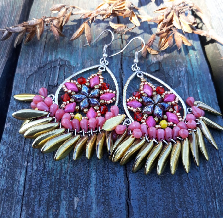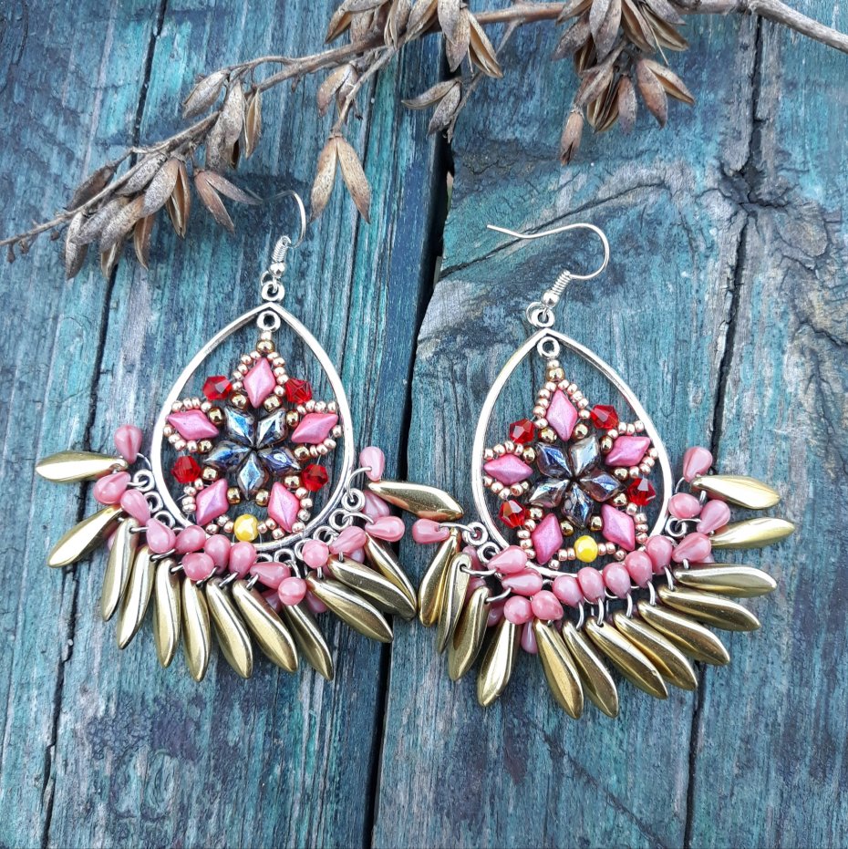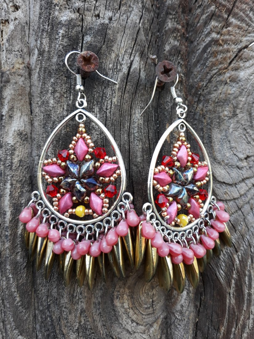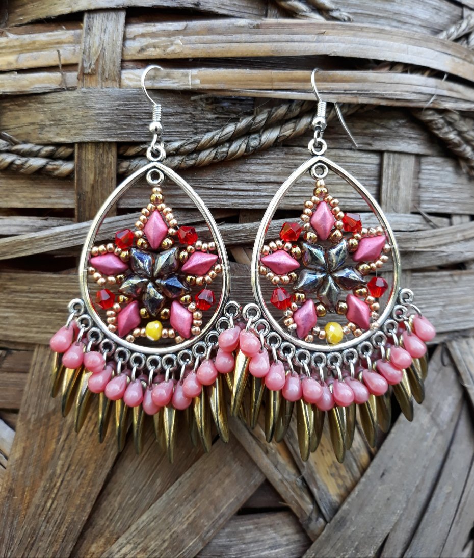 ,,z gwiazdką,, to wiszące kolczyki wykonane na obręczach ze szklanych koralików i kryształków w różnych odcieniach różu, złota i czerwieni.