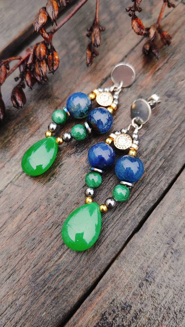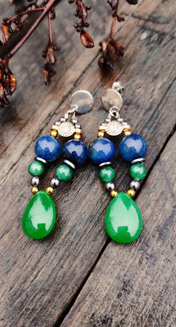 ,,z jadeitową łezką,, to kolorowe kolczyki wykonane z zielonego jadeitu, czarnego i złotego hematytu, niebieskiego turmalinu i zielonego marmuru. Kolczyki zawieszone są na ozdobnych biglach typu sztyft.