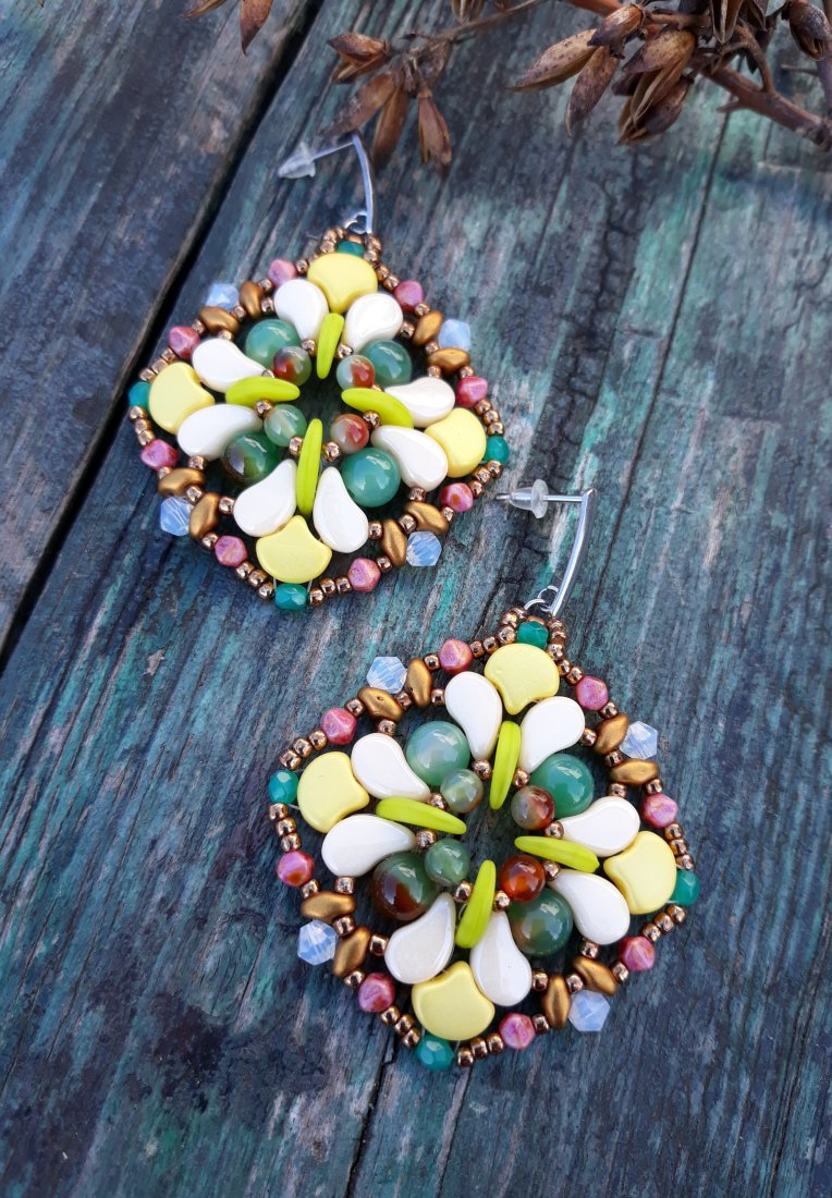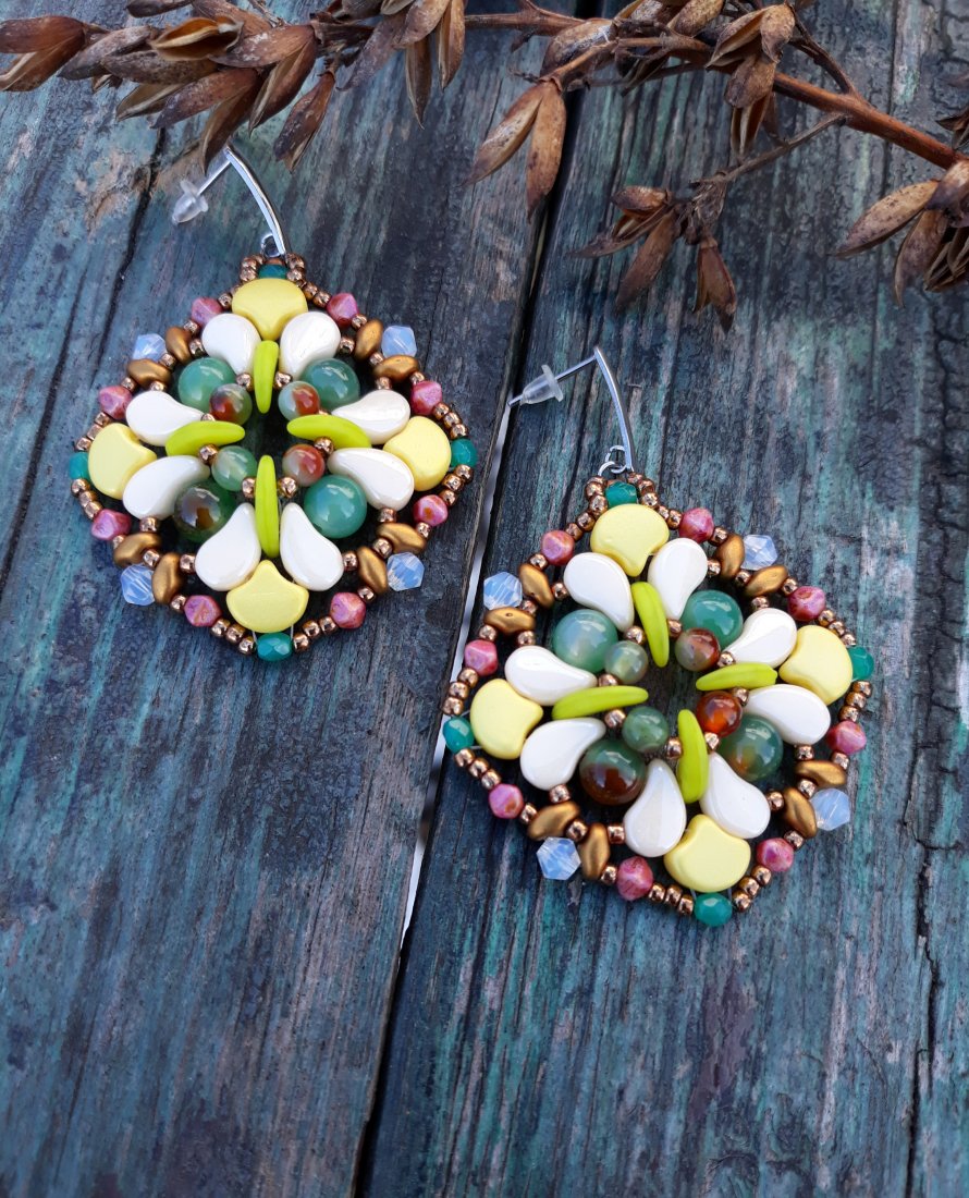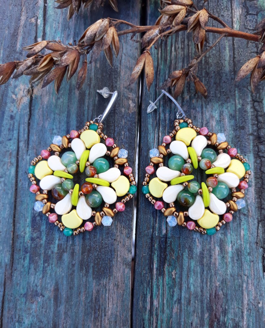 ,,z kolorowym agatem,, to utrzymane w kolorystyce beżu i zieleni ażurowe kolczyki wykonane ze szklanych koralików i kryształków w różnych odcieniach żółtego, złota, różu, bieli i zieleni. Całości kolczyka dopełniają koraliki z kolorowego agatu.