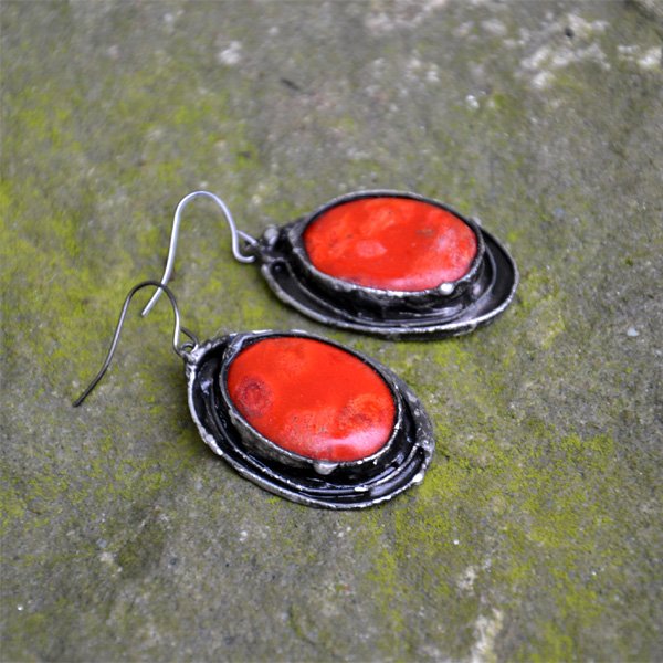 Bardzo efektowne kolczyki z koralem. Oprawa wykonana z miedzi pokrytej ekologiczna cyną w kolorze starego srebra. Długość całego kolczyka to ok. 5 cm. Biżuteria w 100% wykonana ręcznie, poszczególne sztuki mogą się minimalnie różnić.