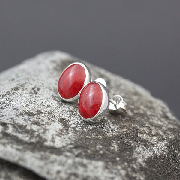 Czerwony koral ubrany w srebro, próby 925. Wielkość kolczyków 11x9 mm. Kolczyki są ozdobnie zapakowane.
