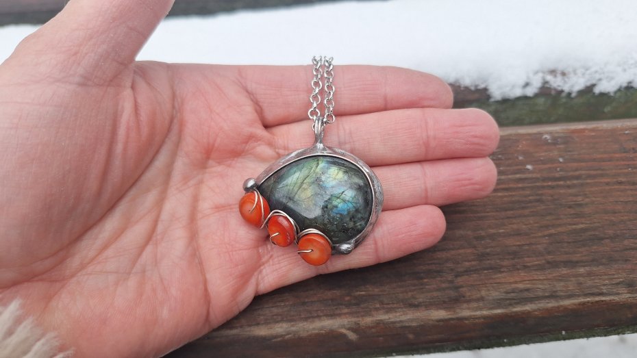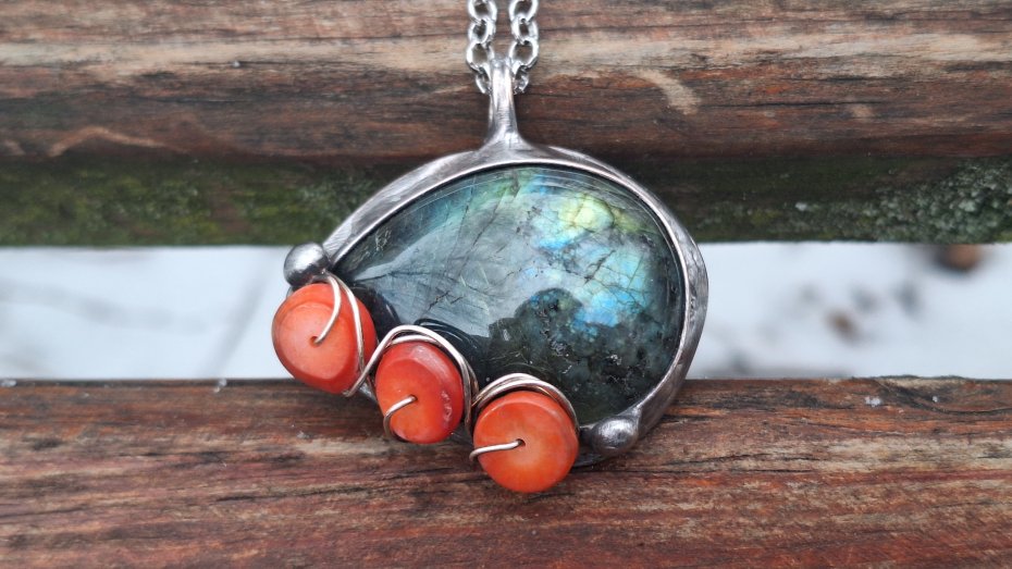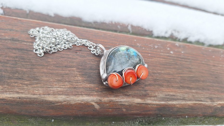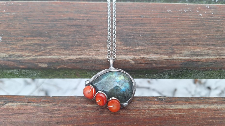 Tagi: #kolorowy wisiorek, #koralowiec, #wisiorek z kamieniem, #wisiorek z labradorytem