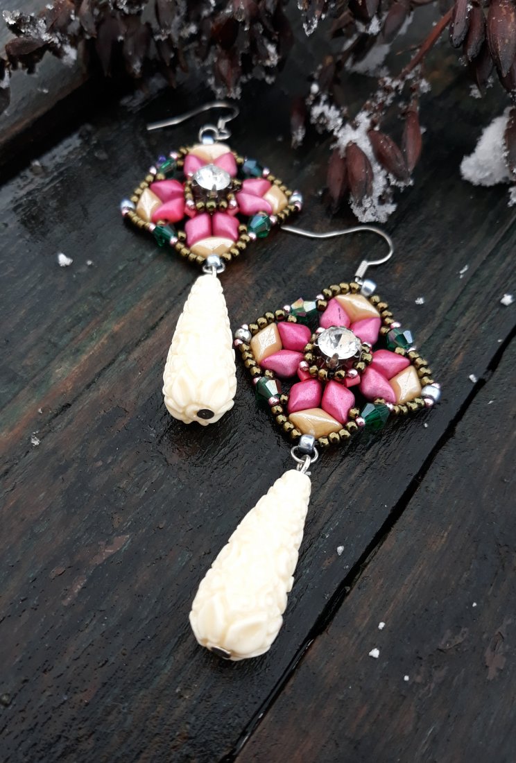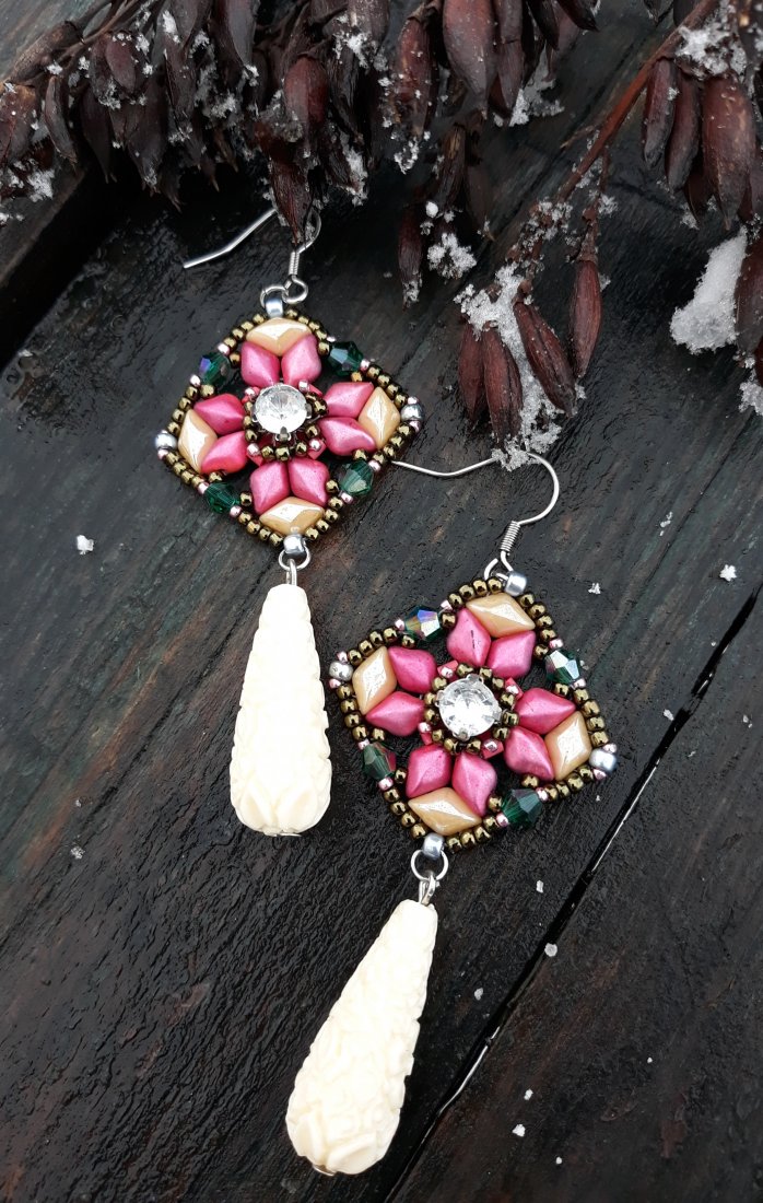 ,,z kroplą,, to kolorowe kolczyki wykonane ze szklanych koralików i kryształków w różnych odcieniach różu, beżu, złota i zieleni. Całości kolczyka dopełnia kropla w kolorze jasnego beżu. Kolczyki zawieszone są na klasycznych biglach wykonanych ze stali szlachetnej.