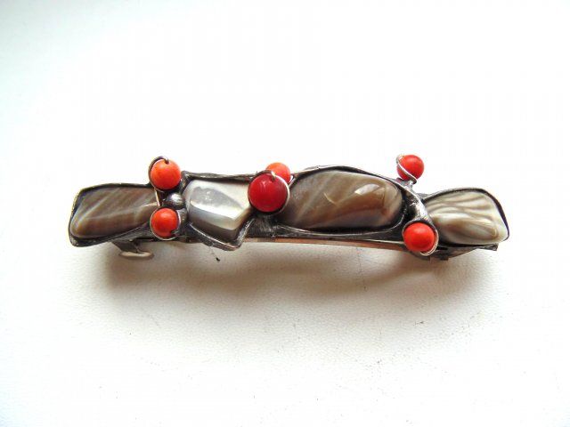 Klamra do włosów, wykonana techniką witrażową z krzemieni pasiastych i koralowców. Zapięcie metalowe, automatyczne. Wymiary ok. 8 na 1,3 cm.