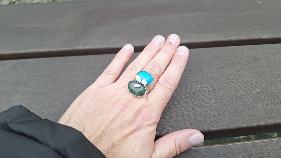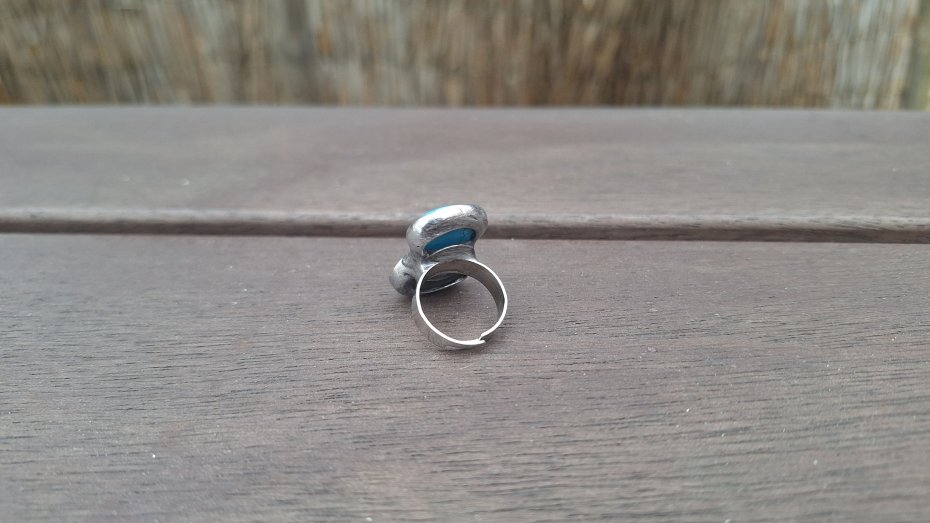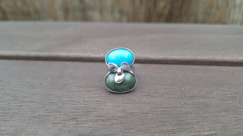 Pierścionek wykonany z miedzi, cyny, howlitu i jadeitu. Wymiary ok. 2.3 na 1.8 cm. Regulowany. Nie jest ciężki.