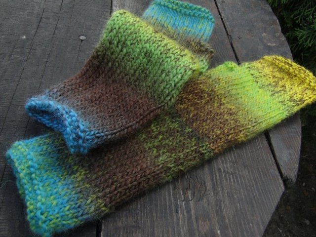 Ciepłe, mięsiste mitenki wykonane na drutach z włóczki w odcieniach brązu, zieleni, żółci i turkusu ( 100% wełna ) - bezszwowe, długość ok. 28 cm. Polecam.