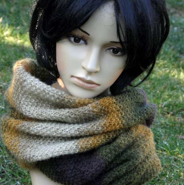 Przepiękny komin, zamotka... wykonany ręcznie na drutach z włóczki w odcieniach gorzkiej czekolady, zieleni, musztardy i beżu . Miękki i miły w dotyku, delikatnie puszysty. Otulak można zawinąć na dwa razy. Wymiary otulaka: obwód ok. 130 cm x szer. 41 cm. Skład: 80% AKRYL - 10% MOHER - 10% WEŁNA