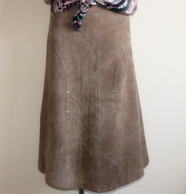 Spódnica z miękkiego, naturalnego zamszu marki Lindon, o trapezowym kroju. Dół zaokrąglony, boki krótsze. Ładne cięcia. Z tyłu zamek. Pod spodem podszewka w kratkę. Stan bardzo dobry, prawdopodobnie nieużywana. Rozmiar z metki 38. Podaję wymiary mierzone na płasko;