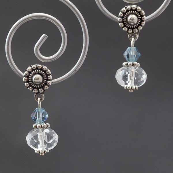 Fasetowane oponki kryształu górskiego (9mm) oraz kryształki Swarovskiego (5mm) zawieszone na ozdobnych sztyftach bali. Elementy wykończeniowe srebrne, próba 925. Długość kolczyków 2,1 cm. Kolczyki są ozdobnie zapakowane.