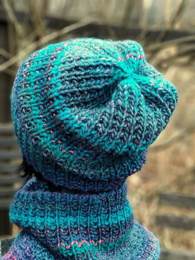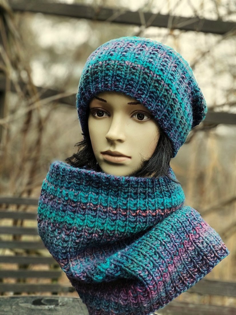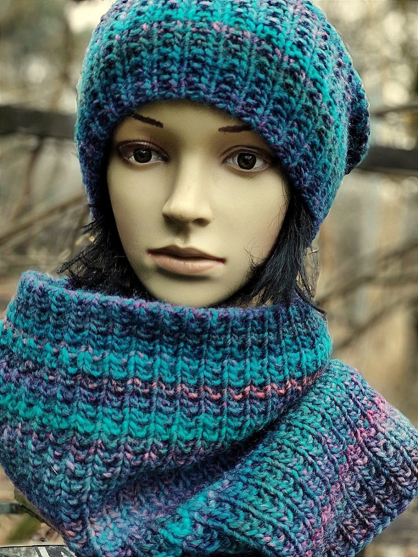 Ciepły, miękki ( wykonany niezbyt luźno, aby nie hulał po nim wiatr :) ) i przyjemny w dotyku komplet wykonany ręcznie na drutach z rewelacyjnej włóczki prod. hiszpańskiej ( 53% wool, 47% akryl)