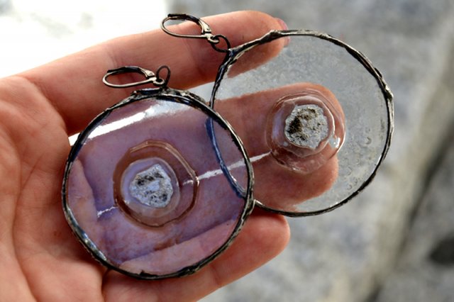 Duże, piękne, szklane kolczyki ze srebrną kropelką w środku. Rustykalna prosta oprawa w kolorze starego srebra wykonana z miedzi pokrytej ekologiczna cyną. Długość całego kolczyka to ok. 7 cm. Średnica koła to ok. 4,5 cm. Biżuteria w 100% wykonana ręcznie, poszczególne sztuki mogą się minimalnie różnić.