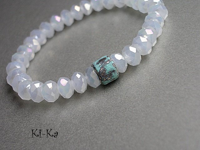 Bransoletka wykonana z fasetowanych szklanych oponek z opalizacją [8mm, szkło bardzo dobrej jakości] oraz mosiężną przekładką, którą pokryłam patyną [naturalny przyspieszony proces patynowania] i zabezpieczyłam lakierem. Bransoletka na gumce silikonowej. Pasuje na nadgarstek 14-16cm. Biżuteria ozdobnie zapakowana. Bransoletka może stanowić komplet z innymi bransoletkami - przykładowe zdjęcia