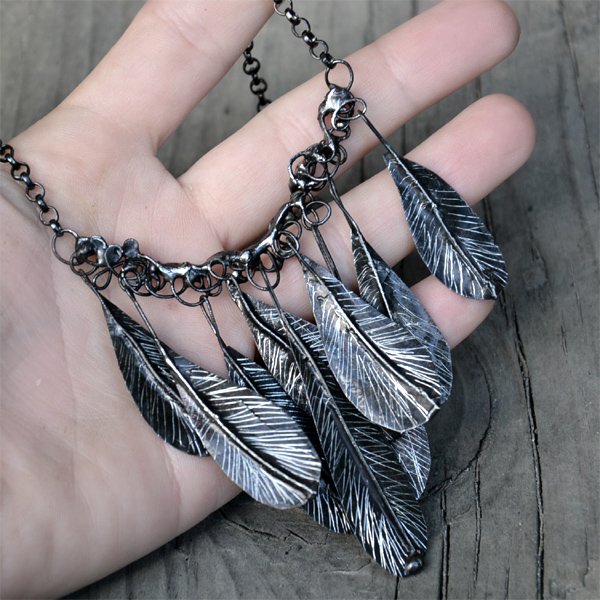 Boho naszyjnik z z piórami wykonanymi z miedzi pokrytej ekologiczną, bezołowiową cyną.. Obwód kolii to ok. 50 cm + 5 cm regulacja (chętnie wykonam naszyjnik w każdym rozmiarze). Długość największego piórka to ok. 7 cm. Biżuteria w 100% wykonana ręcznie, poszczególne sztuki mogą się minimalnie różnić.