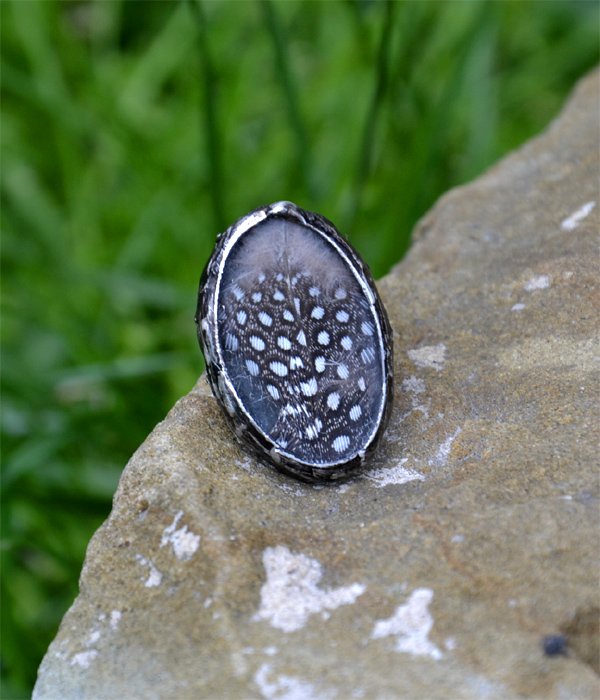 Duży, tajemniczy pierścionek z prawdziwym piórkiem zamkniętym w szkle. Wymiary oczka pierścionka to ok. 4 x 2,5 cm. Oprawa stylizowana na stare srebro wykonana z ekologicznej cyny Obrączka regulowana. Biżuteria w 100% wykonana ręcznie, poszczególne sztuki mogą się minimalnie różnić.