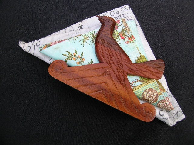 Drewniany serwetnik, ręcznie wykonany i zdobiony. Drewno wygląda na egzotyczne. 12,5 x 3 x 9,5 cm. Satynowo lakierowany. Stan zachowania bardzo dobry.