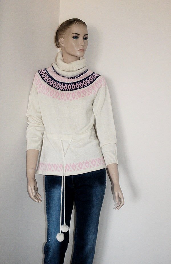 Cudny Sweter w zimowym klimacie, marki saints&mortals. materiał 30% wełny, 70% akrylu. W pasie wiązanie z pomponami. Rozmiar z metki S. Na 38 także powinien pasować. Stan bardzo dobry. Kolor ecru, wzór fioletowo różowy. Podaję wymiary mierzone na płasko;