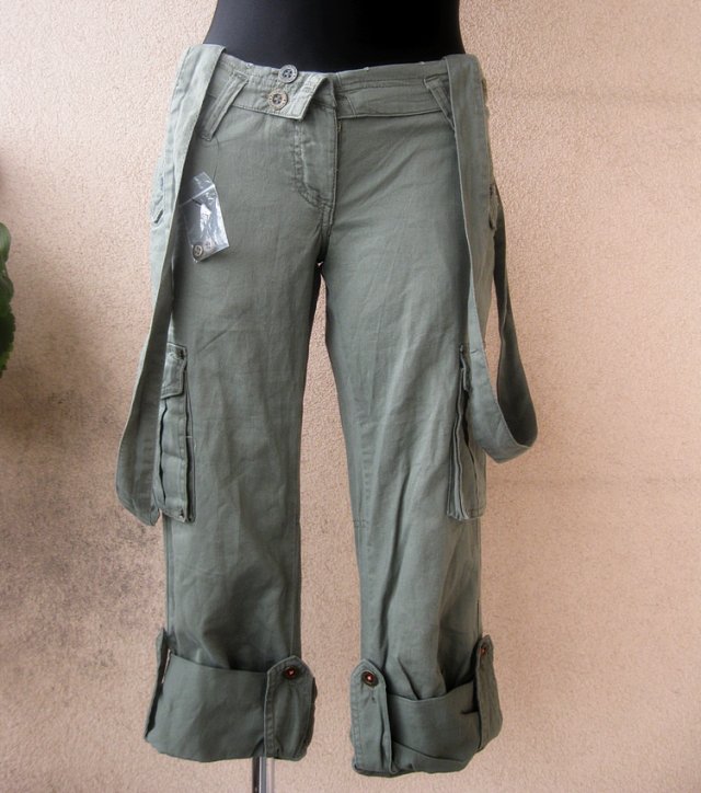 Spodnie marki Jeans Please, z niskim stanem w oliwkowym kolorze, nowe. Materiał 100% bawełna. Dużo ozdobnych elementów Na dole nogawek podpięcia paskami. Szelki można odpinać. Rozmiar z metki 34, ale chyba trochę większe. Podaję wymiary mierzone na płasko;