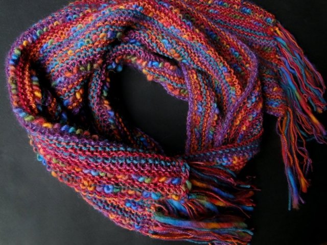 Niepowtarzalny długi szal , wykonany ręcznie na drutach z różnych włóczek w soczystych odcieniach fioletu, turkusu, pomarańczu, różu. Ciepły i dobrze się układa. Niestety zdjęcia nie oddają pięknych niuansów kolorystycznych. Wymiary: 215 z frędzlami x 20 cm. Skład: głównie wełna, moher, akryl. Polecam serdecznie. Pojedynczy egzemplarz.