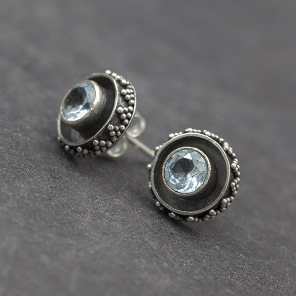 Kolczyki - sztyfty wykonane ze srebra próby 925 oraz błękitnych topazów (5mm). Wielkość kolczyków 10 mm. Kolczyki są ozdobnie zapakowane.