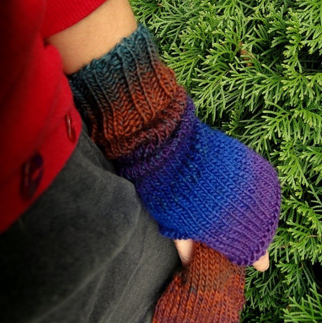 Ciepłe, mięsiste mitenki wykonane na drutach z włóczki ( 100% wełna ) - bezszwowe, długość ok. 29 cm. Przepiękne kolory ubarwią każde okrycie. Polecam. Ze względu na układ barw - pojedynczy egzemplarz.