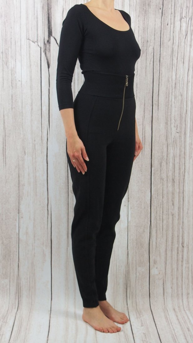 Świetne spodnie zapinane z przodu na zamek. Wyszczuplający krój i podłużne prążki wysmuklą sylwetkę. Z nylonu 80%, bawełny 17% i elastyny 3%. Holenderskiej marki Boris.